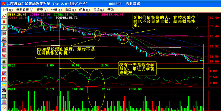 这二个指标反映的,整个时间段里面根本就没有一天是适合参与的,在后面短短几个月时间里,股价腰斩,一直等到去年10月份的大行情才勉强解套!这就是轻视KZQD与KQDX指标,死抱价值投资的惨痛教训。