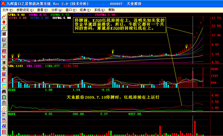 不需要举太多的例子,牛股他们都有一个共同的密码,只要有资金在提前潜伏,稍稍布局,虽然他们做得很隐秘,但他们毕竟要通过市场吸纳才能实现收集筹码,只要收集筹码,它就逃不过KZQD与KQDX二个盘口强度指标的跟踪。所以,只要KZQD指标的红线持续在上,你就可以确认肯定有资金在提前潜伏,虽然你不知道这些资金为何而来,虽然你不知道这个股票后面会发生什么故事,但你只需明白,潜伏的资金他们知道,你只需跟住他们就可以了!特别是对于做重组潜伏的投资者,如果KZQD的红线持续在上,你就值得潜伏,如果是绿线长期在上的,那就得小心消息有假!同样,如果有朋友告诉你一些重要消息,那你也可以通过KZQD来判断一下这个消息是否可靠。