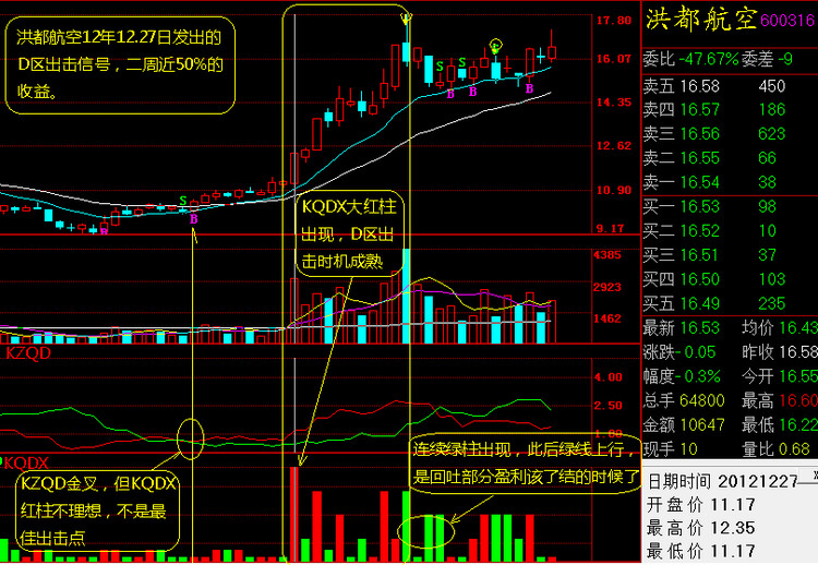 上图是中600765航重机2013年年初的翻倍行情走势,从KZQD指标(倒数第二图)中可以清晰地看到A,B,C,D四个区,2012年12.28日前的一段区域是A区,12月31日到13年1月9日金叉前是B区,1月10日开始金叉进入C区,1.18日后可确认进入D区。该股13年1月10日KZQD红线上穿绿线,形成金叉,当日KQDX为大红柱,形成了经典的C区出击形态,是极佳的参与时机,此后,红线持续上行,可继续持有,到13年2.1日绿线上穿红线,则一波行情结束,已经没有持有的价值了,此时则该及时抽身退出。
